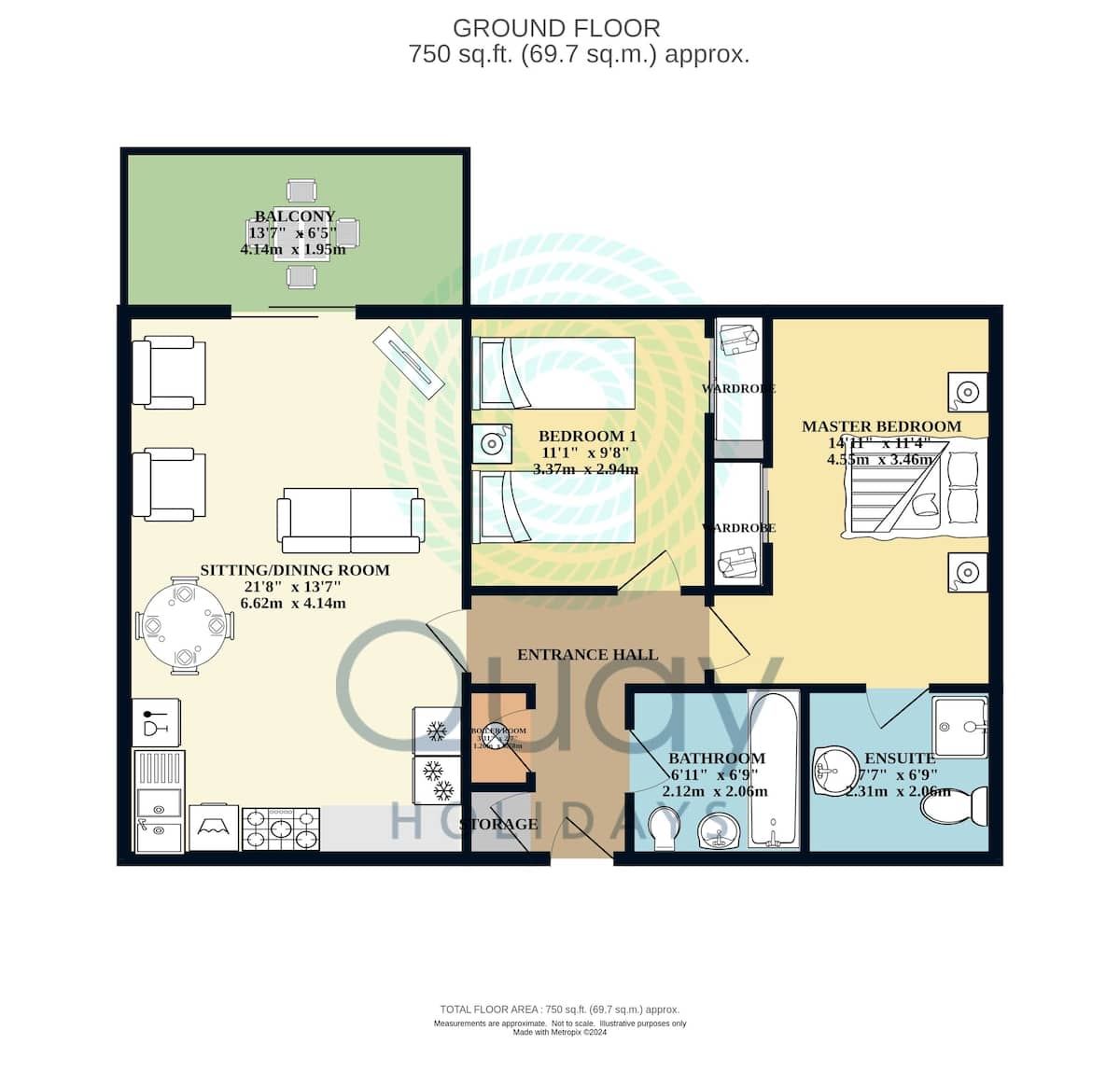 Lift and level access. Open plan Lounge / Dining area leading to a balcony with harbour views. Comprehensively equipped throughout. Fully fitted kitchen. Master Bedroom (4ft 6ins standard double) benefiting from ensuite bathroom (shower cubicle, sink and toilet). Second bedroom (twin beds – 2x 3ft singles). Family bathroom (bath with shower over, toilet and sink).