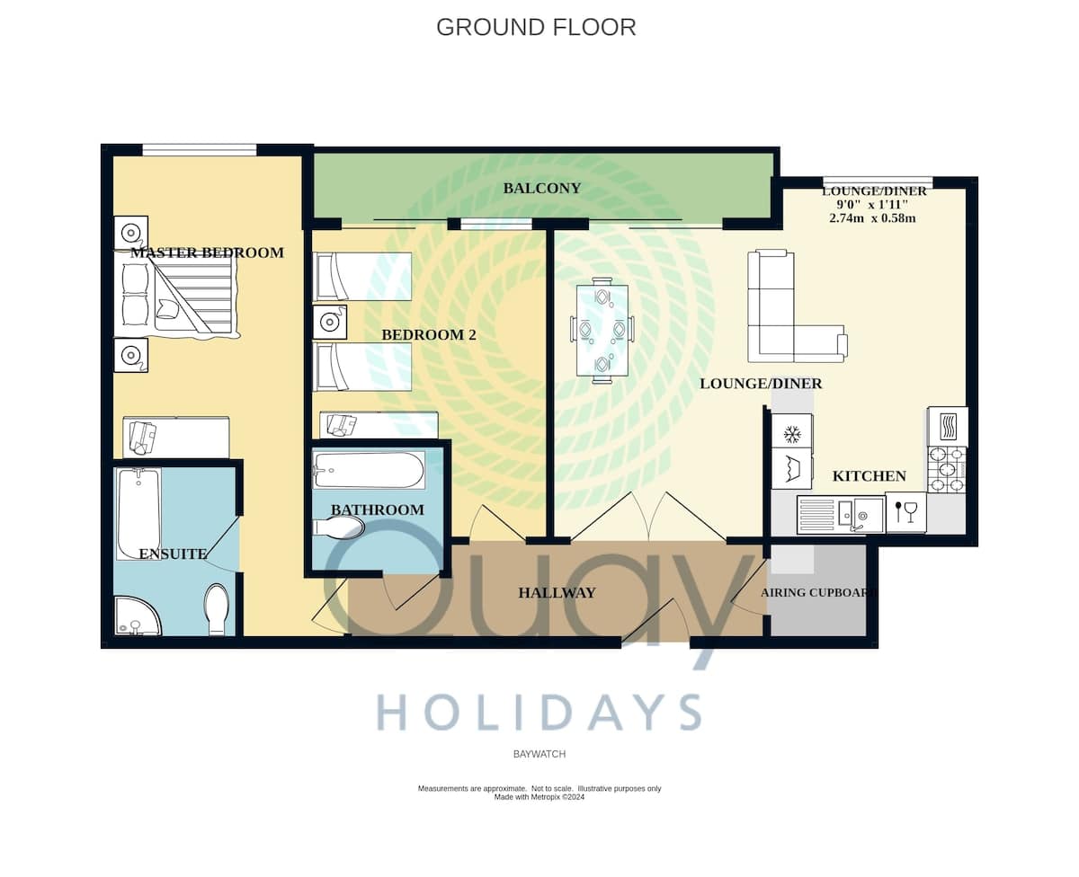 Spacious hallway to front door. Hall, Lounge / Dining Room with doors to Balcony – views to the harbour and quay. Comprehensively equipped. Fully fitted kitchen. Master Bedroom (5ft double) En suite (bath with separate shower). 2nd Bedroom (3ft twin beds) Main bathroom (bath and toilet) doors to Balcony from second bedroom with views to the harbour.