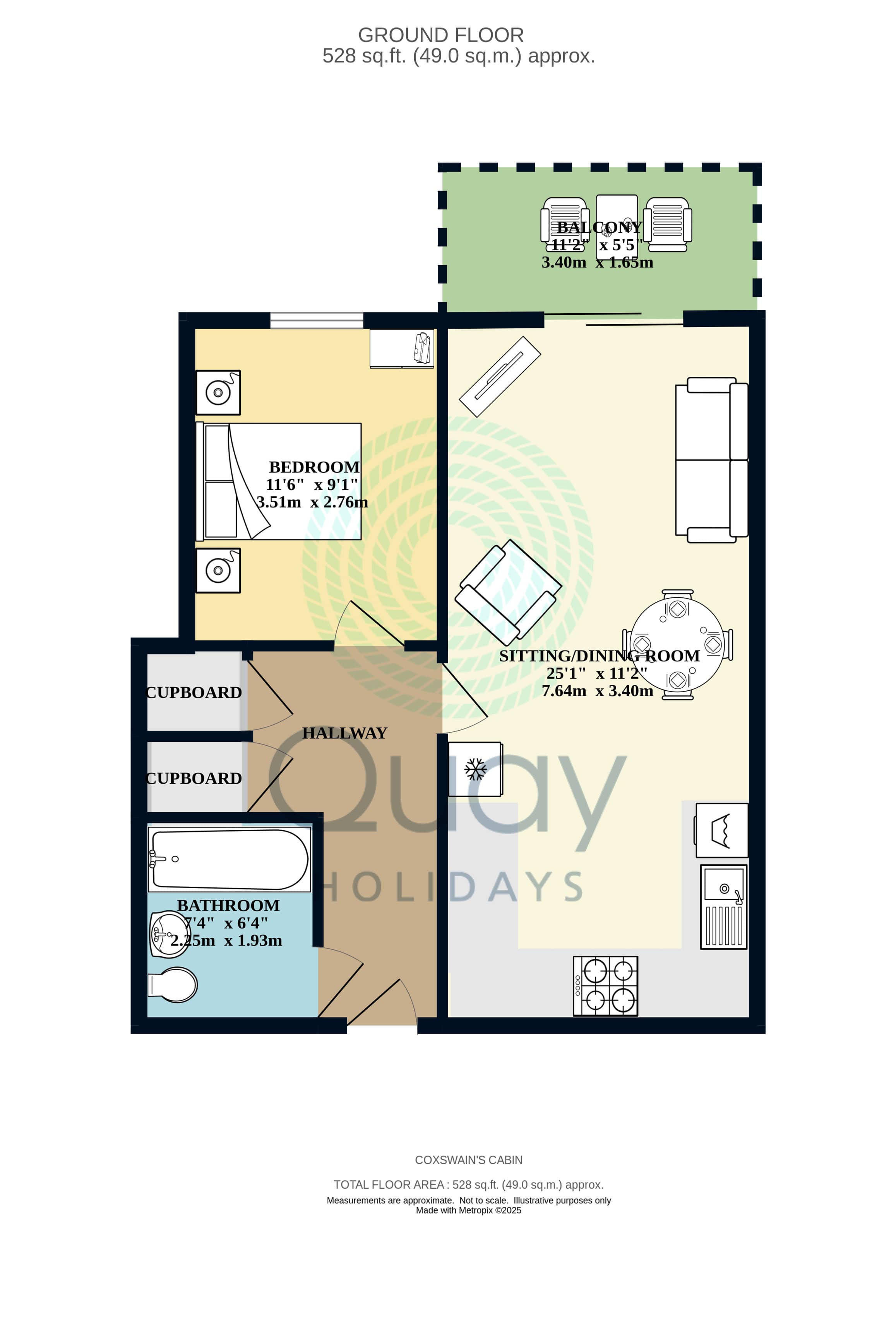 Level access (lifts to parking area). Spacious hallways to front door. Hall, Lounge / Dining Room / Kitchen open plan area with doors to balcony and views to the inner harbour area. Comprehensively equipped throughout. Fully fitted kitchen. Master Bedroom (5ft kingsize double) and family bathroom (bath with shower over).