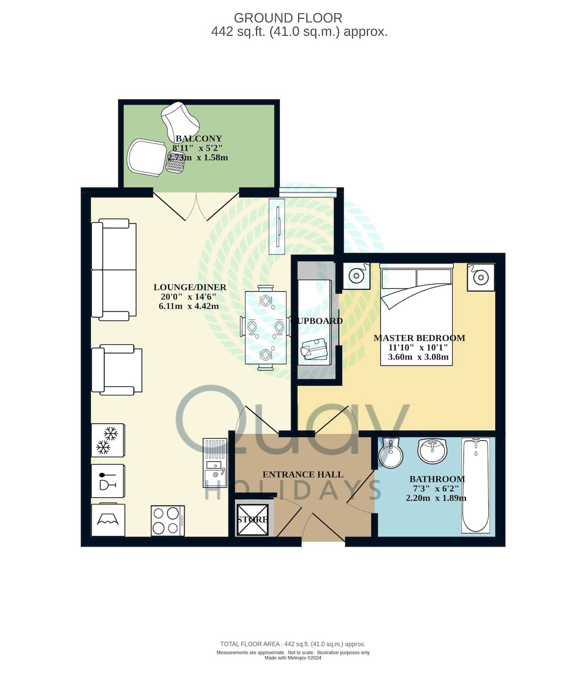 Stylish furnishing throughout. Open plan living, dining and kitchen area. The living area benefits from a flatscreen 37 inch LED flatscreen television with Sony Blueray DVD, Sony Music Dock, Broadband and Telephone (for incoming calls only). The apartment also benefits from a balcony with town views and harbour glimpses. The fully fitted kitchen area contains all modern appliances including a 4-burner gas hob and electric oven, dishwasher, fridge / freezer, microwave and washer / drying machine. There is one bedroom (5ft kingsize double) with LG 22 inch flatscreen television and LG Blueray DVD player. Family bathroom (bath with shower over, sink and toilet).