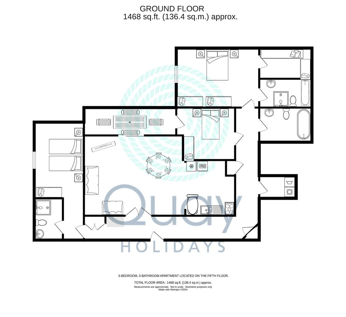 Main entrance lobby from The Quay. Lifts to 5th floor. Spacious hallways to front door. Hall, Lounge / Dining Room with sliding doors to balcony. Comprehensively equipped. Fully fitted Miele kitchen. Utility room with washing machine and tumble dryer. Master Bedroom (6ft Superking) with ensuite (bath and separate shower cubicle) and separate dressing room and TV, 2nd Bedroom (5ft King), family bathroom (bath) located just opposite, 3rd Bedroom (2x 3ft single beds as twin or zip/link superkingsize double) with ensuite (shower cubicle).