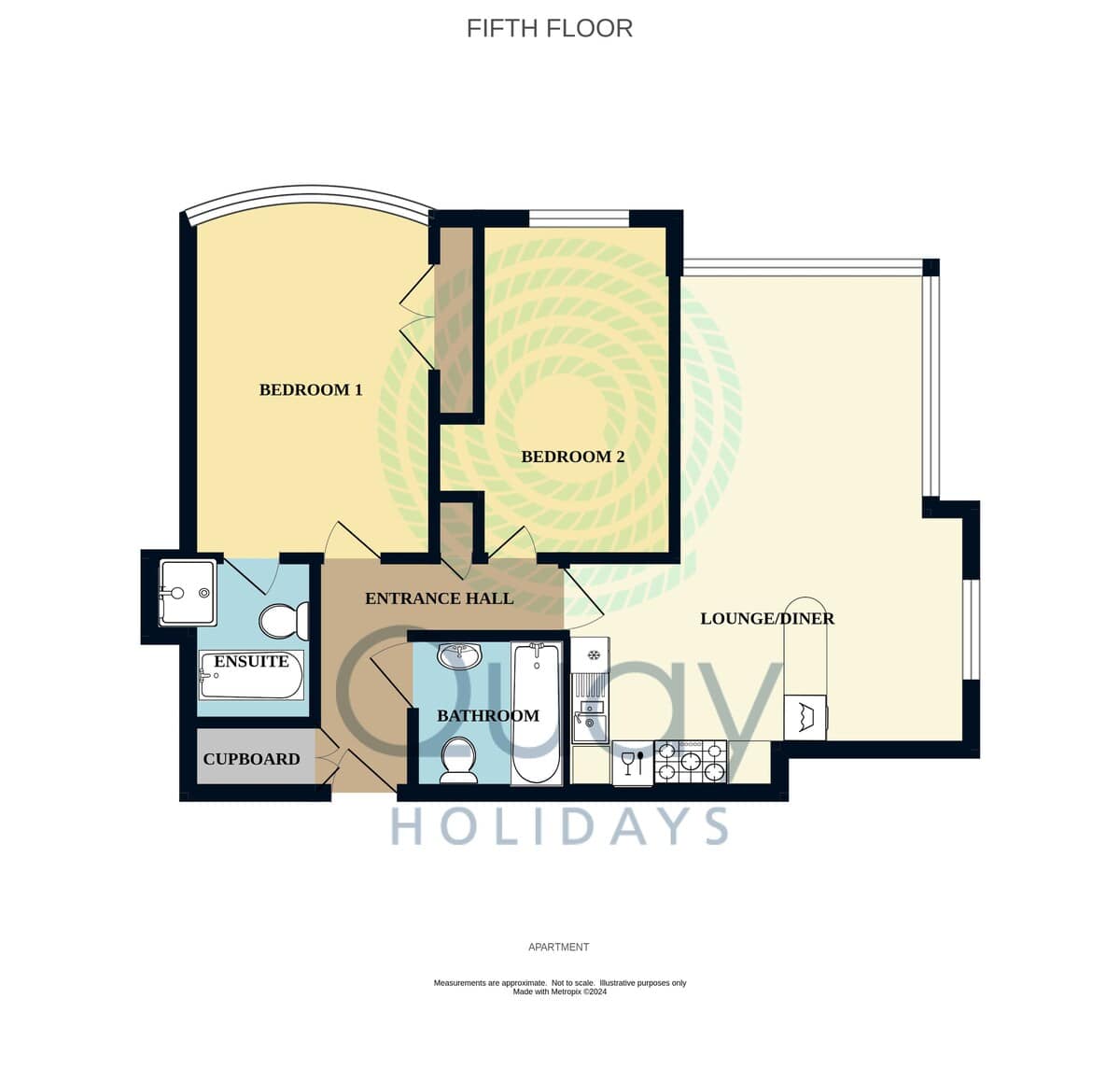Main entrance lobby from The Quay. Lifts to 5th floor. Hall, open plan lounge / dining room and kitchen areas. Fully fitted Miele kitchen. Comprehensively equipped. Master Bedroom (5ft kingsize double) with ensuite (bath and separate shower cubicle, sink and toilet). Second bedroom (4ft 6ins standard double). Family bathroom (bath, sink and toilet).