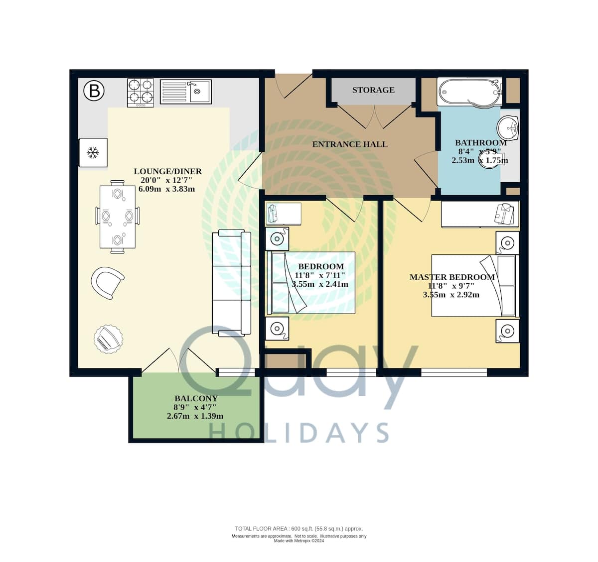 Light and bright with views from every window and a balcony perfect for your morning coffee. Open plan Lounge, Dining and Kitchen area. Kitchen fully fitted with Bosch appliances. Master bedroom (5ft kingsize double). Second bedroom (standard 4ft 6″ double) and a family bathroom (bath with shower over, sink and toilet).